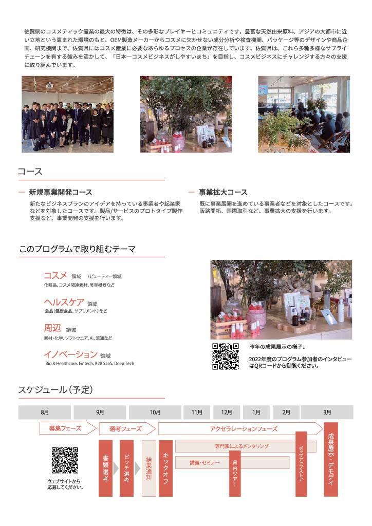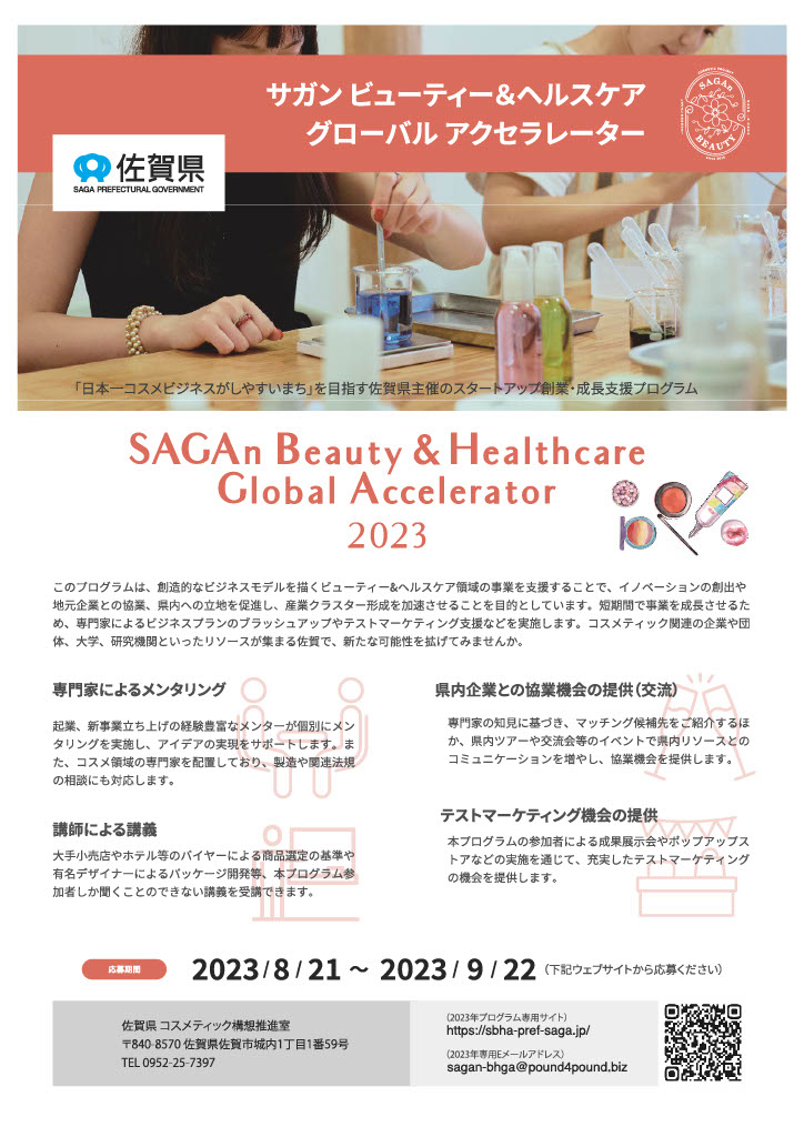 佐賀県が実施する美と健康に特化した全国唯一の新規ビジネス支援プログラム「SAGAn BEAUTY & HEALTHCARE Global Accelerator」。