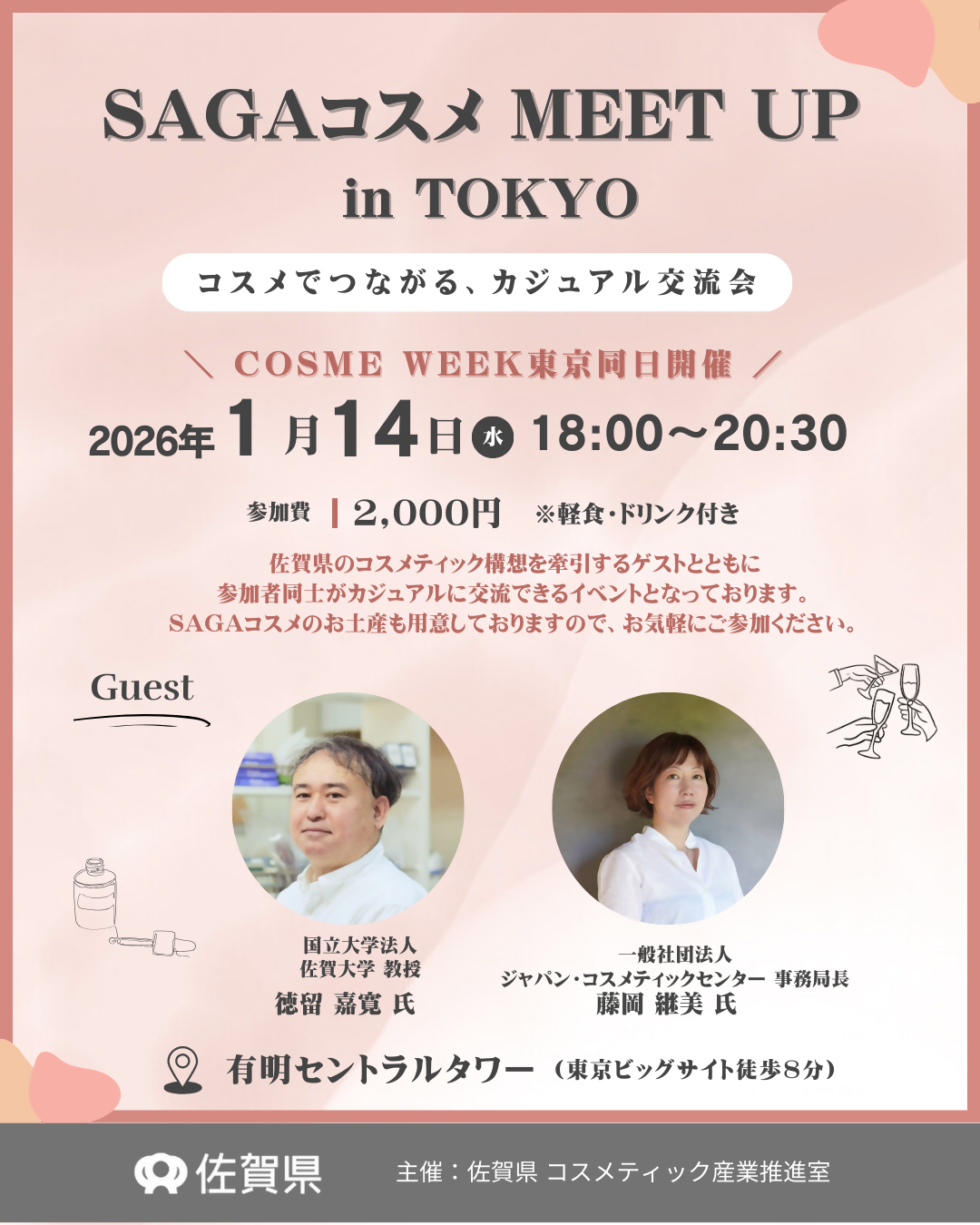 佐賀大学で佐賀県産素材を使った化粧品の開発にまつわる研究や経皮吸収技術の開発に取り組むコスメ研究の第一人者である徳留教授や、コスメティック構想実現に向けて発足した産官学連携組織ジャパン・コスメティックセンターの藤岡事務局長をゲストに迎えたクロストークに加え、参加者同士の交流ができるカジュアルなイベントとなっております。