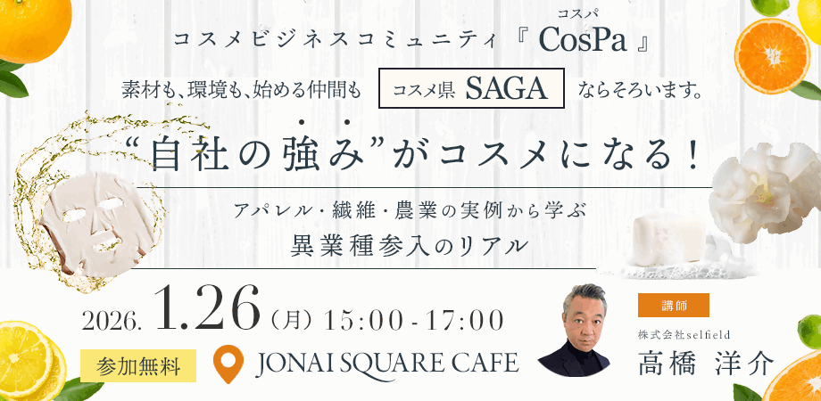 ゲストには、実際に佐賀で異業種(農業)からコスメ開発に取り組まれた副島 幸輔さんをお迎えします。