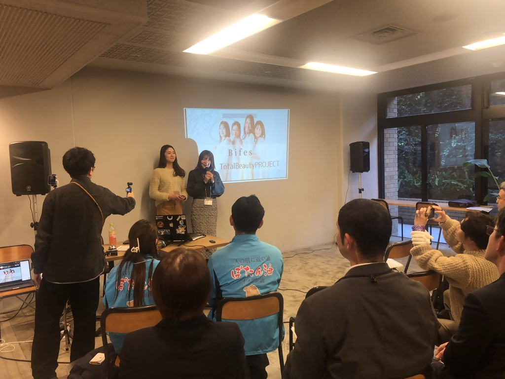 ”女性が美しく輝く”ために美容分野でサポートを行うチームや、全くの異業種からコスメ開発に挑む企業、化粧品開発をトータルで行うOEM企業等、3組の発表がありました。