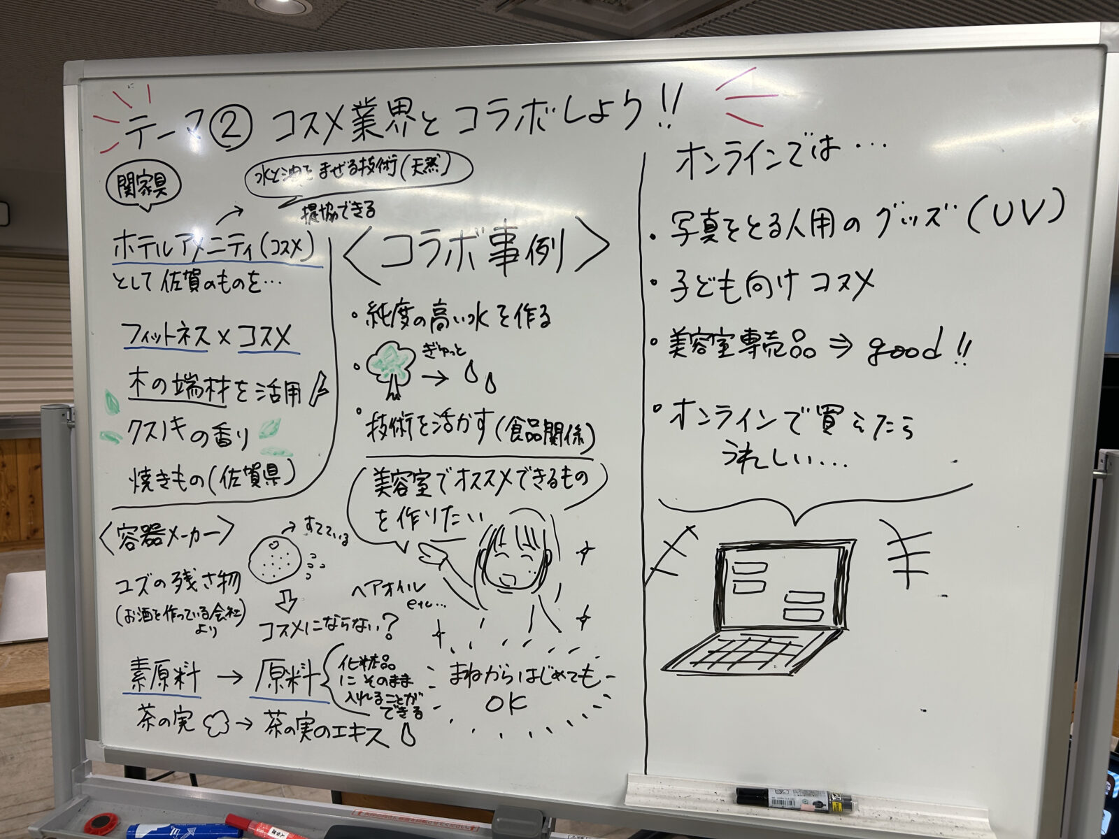 「コスメ業界とコラボしよう」のテーマでは、スポーツ選手とのコラボアイディアや、ホテルで使われるアメニティコスメの話、家具メーカーの方からは「フィットネス×コスメ」の家具アイディアの話など、異業種企業ならではの話題が次々に展開していきました。