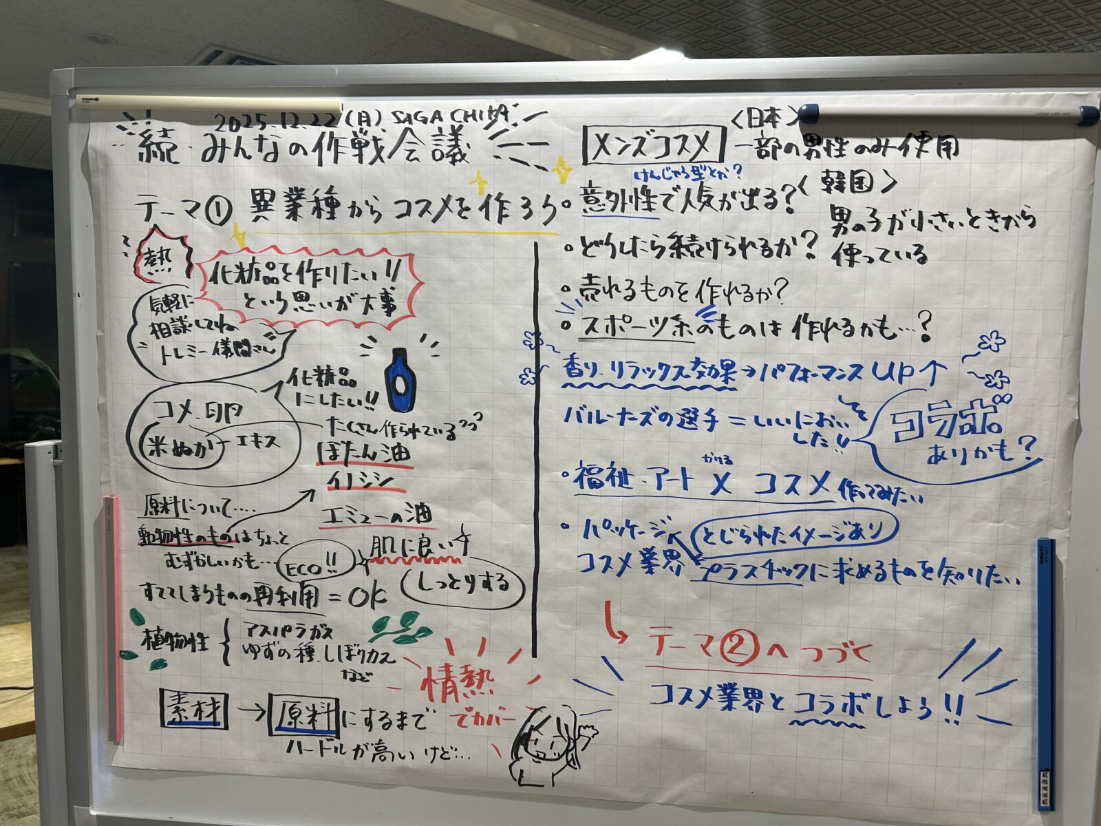 12月22日、Cosme Park SAGA(CosPa)では「続・みんなの作戦会議〜コラボレーションの種が、SAGAコスメの可能性を広げる〜」が開催されました。今回は9月開催の「みんなの作戦会議」の続編。会場とオンライン合わせて約40名が参加し「参加者同士がつながりを広げ、次の一歩を考える場」として「異業種コラボ」をテーマに実施されました。