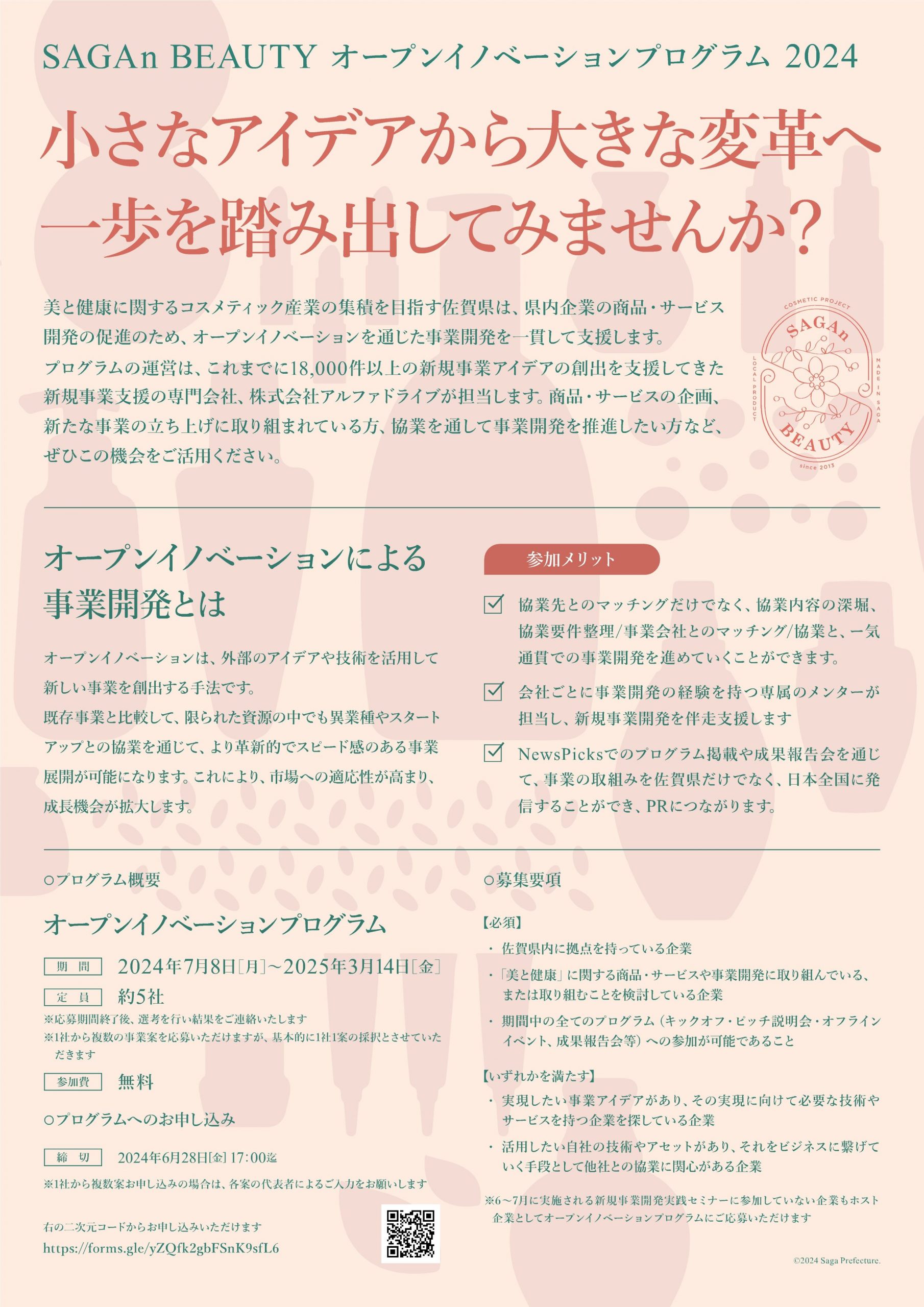 美と健康に関するコスメティック産業の集積を目指す佐賀県は、オープンイノベーションを通じた事業開発を一貫して支援するプログラムを開講します。
