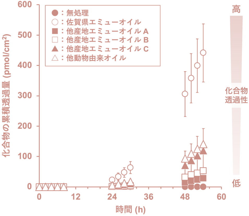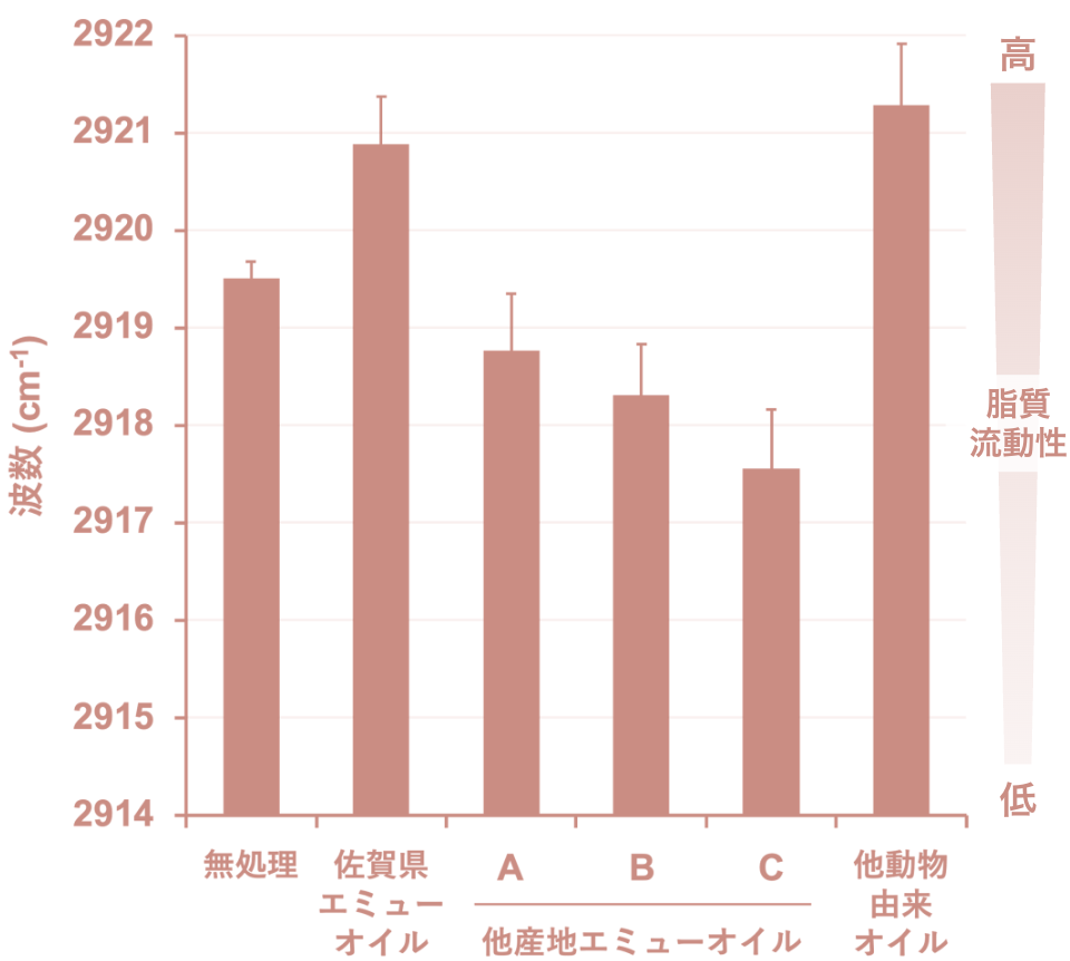 本データでは、オイル処理した膜を用い、水溶性モデル化合物の透過性(左図)と、角層細胞間脂質との相互作用(赤外分光法:右図)を評価しました。左図では、佐賀県産エミューオイル処理でモデル化合物の累積透過量が増えることを示しました。右図(赤外分光法)では、脂質の状態変化を示す指標が高い側にシフトしており、角層細胞間脂質の“動きやすさ(流動性)”が高まることで、水溶性成分の浸透(角層まで)が後押しされることが示唆されます。