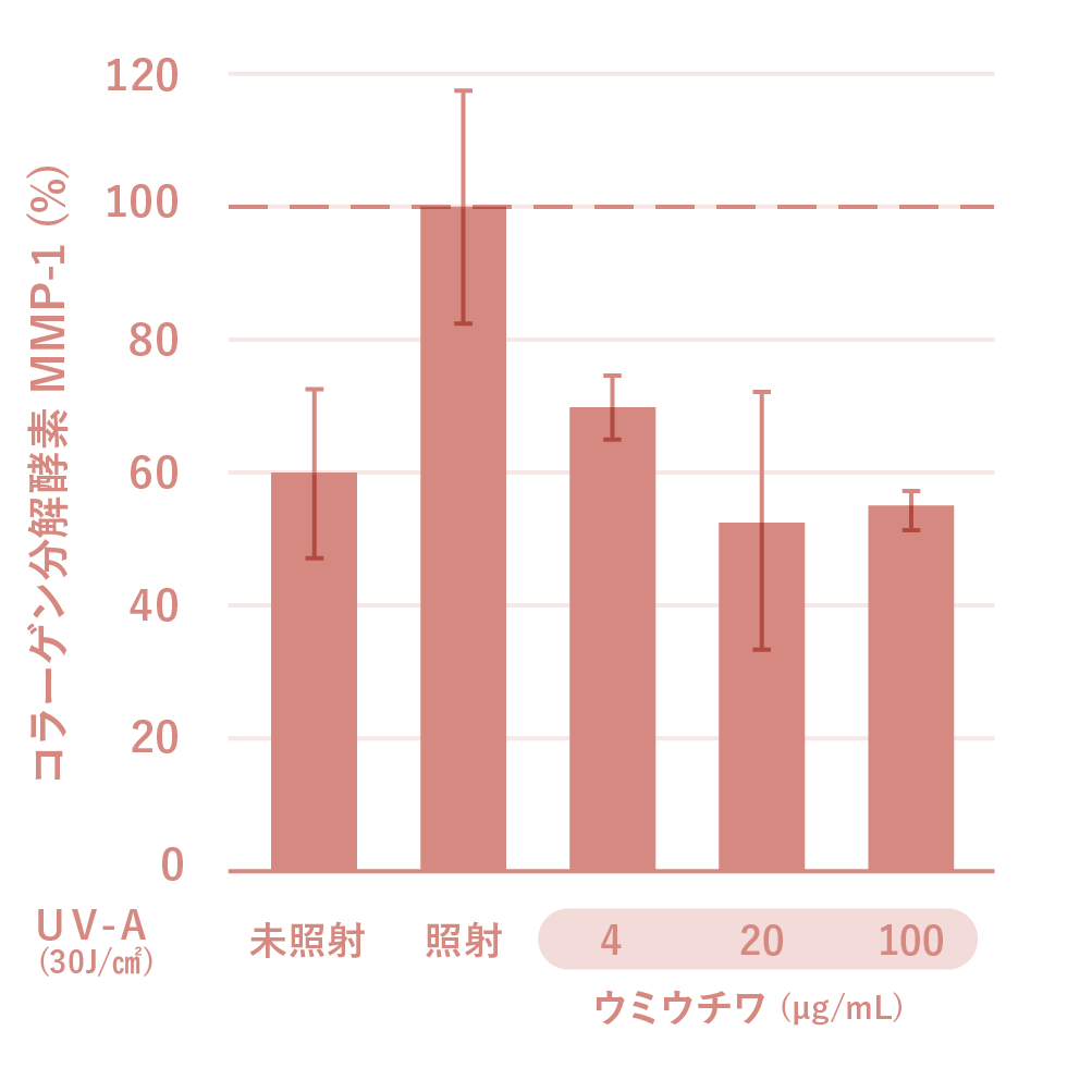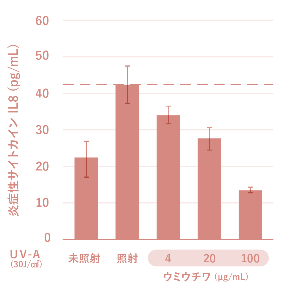ヒトの皮膚を形成する表皮角化細胞の紫外線炎症への影響を評価したところ、ウミウチワは炎症誘導に関与する炎症性サイトカイン(IL-8)、シワの形成やタルミに関与するコラーゲン分解酵素(MMP1)の遺伝子発現を抑制することが確認されました。