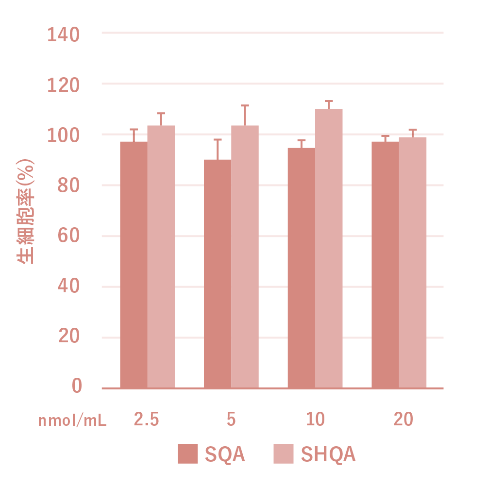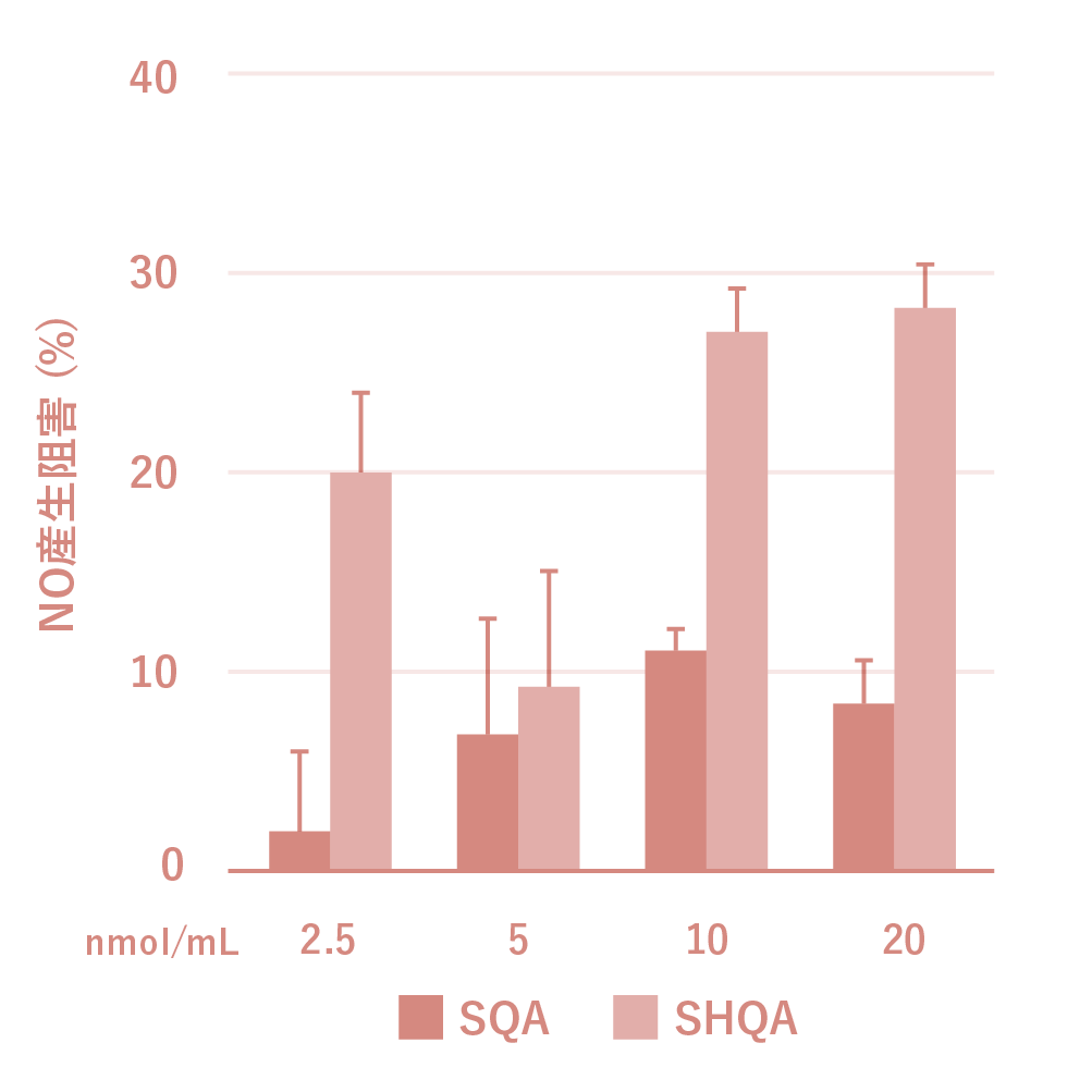 ノコギリモクに含まれるサルガヒドロキノン酸 (SHQA)、サルガキン酸 (SQA)のNO産生(一酸化窒素)抗炎症効果をマウスマクロファージ様細胞RAW264.7への影響を評価したところ、SHQAとSQAは生細胞率に影響を及ぼすことなく、体内の様々な炎症を引き起こすNO産生を抑制することが確認されました。
