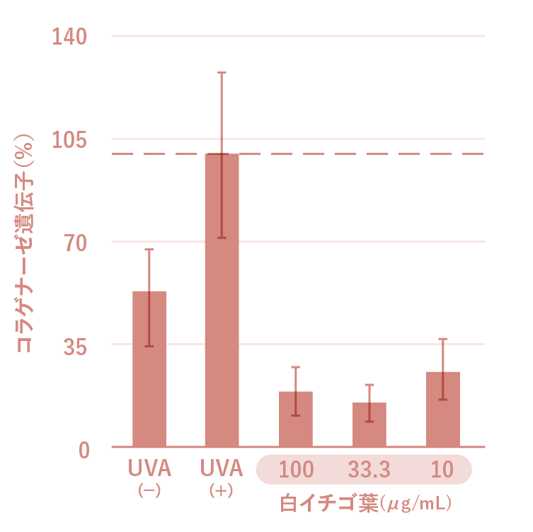 紫外線(UVA)を照射したヒト真皮由来線維芽細胞に白イチゴ葉エキスを添加し、2日間培養。白イチゴ葉エキスがUVA照射によるコラゲナーゼの産生増加を抑制し、コラーゲンの分解に伴うハリの低下やシワ形成の予防が期待される。