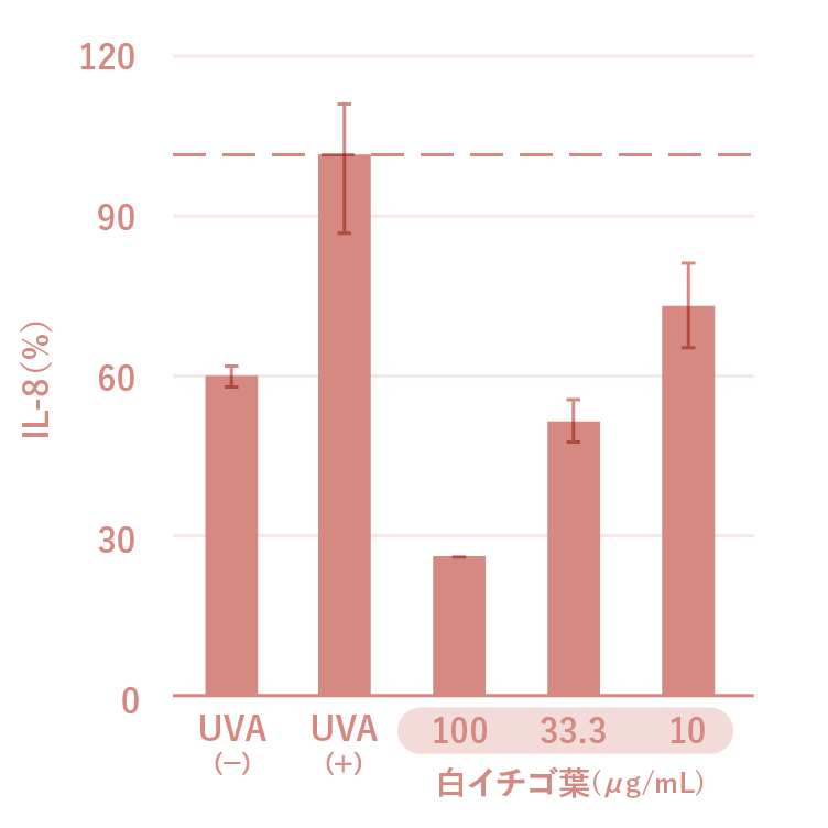 紫外線(UVA)を照射したヒト真皮由来線維芽細胞に白イチゴ葉エキスを添加し、2日間培養。白イチゴ葉エキスがUVA照射による炎症性サイトカイン(IL-8)の産生増加を抑制し、IL-8の産生に伴う皮膚の炎症を抑えることが期待される。