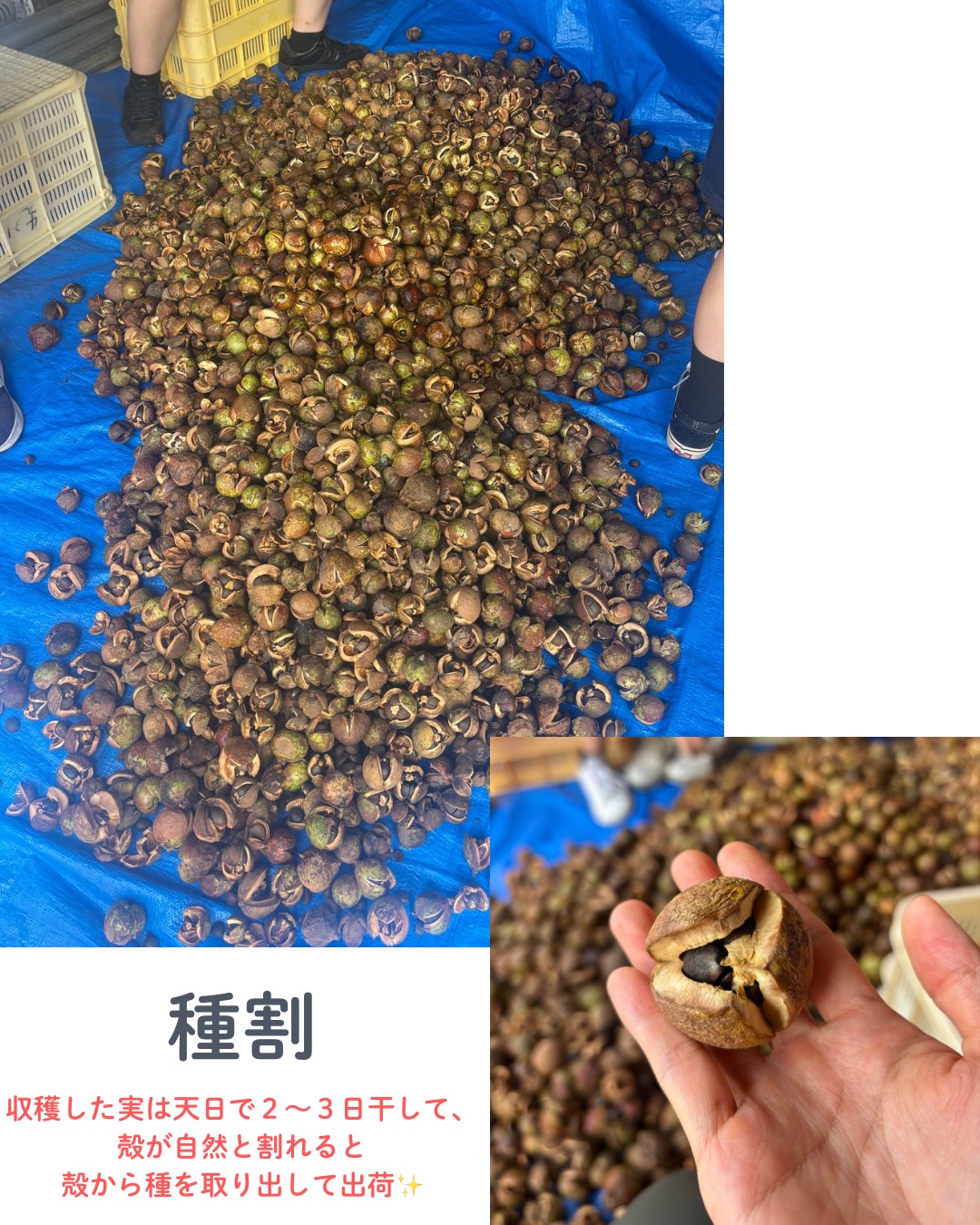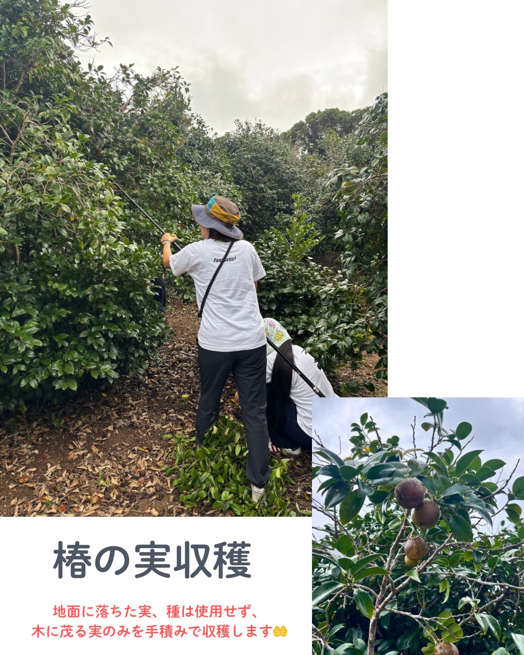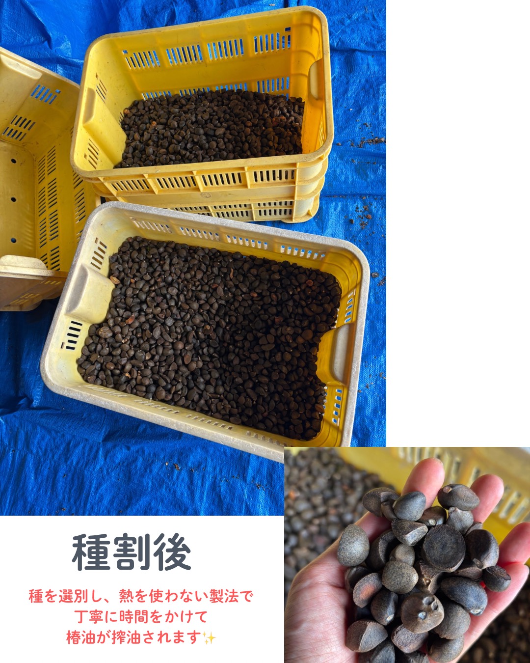 椿の実からとれる椿油は、今でも島の方々の手でひとつひとつ丁寧に採取されており、コールドプレス(非加熱圧搾製法)で搾油からろ過まで、すべて手作業でつくられています。