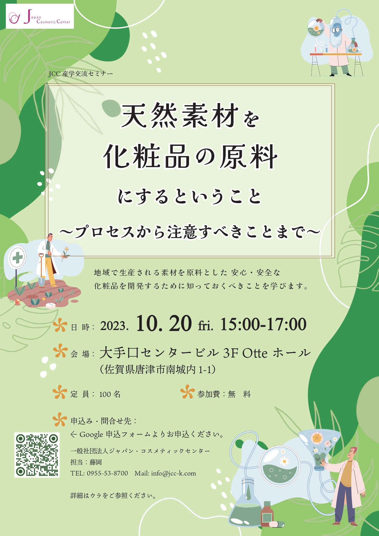10月20日(金)一般社団法人ジャパン・コスメティックセンター(JCC)による「天然素材を化粧品の原料にすること ~プロセスから注意すべきことまで~」が開催されます。
