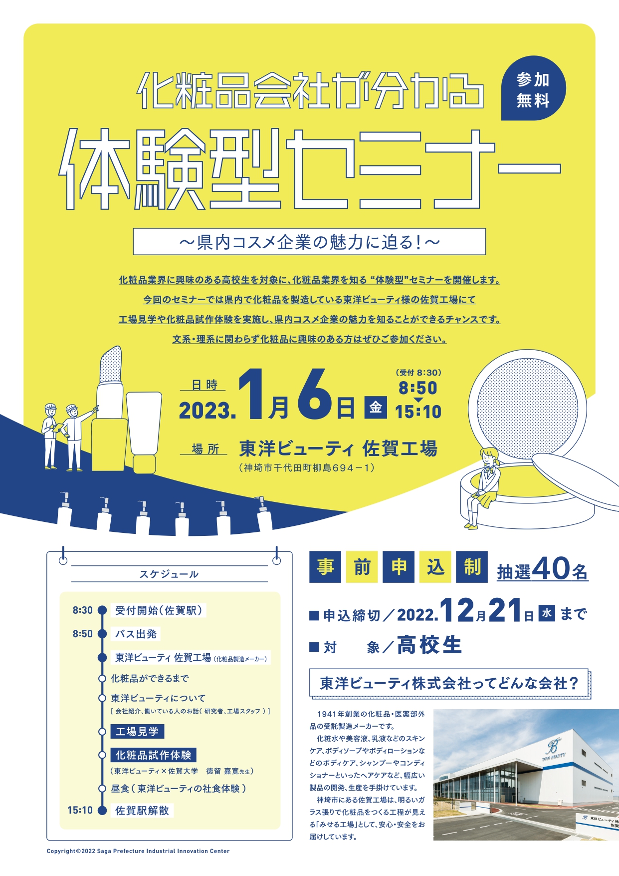 化粧品の工場見学や試作体験を通じて、県内コスメ企業の魅力を体感できるチャンスです!